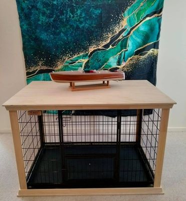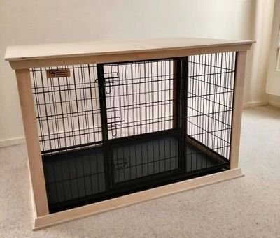 An XXL Escape-Proof Heavy Duty Dog Crate is supplied with a handmade Crate Surround in black, white, or naturally unpainted. Designed for dogs who need a little extra care and protection, giving them a safe, secure space to relax and feel at home.